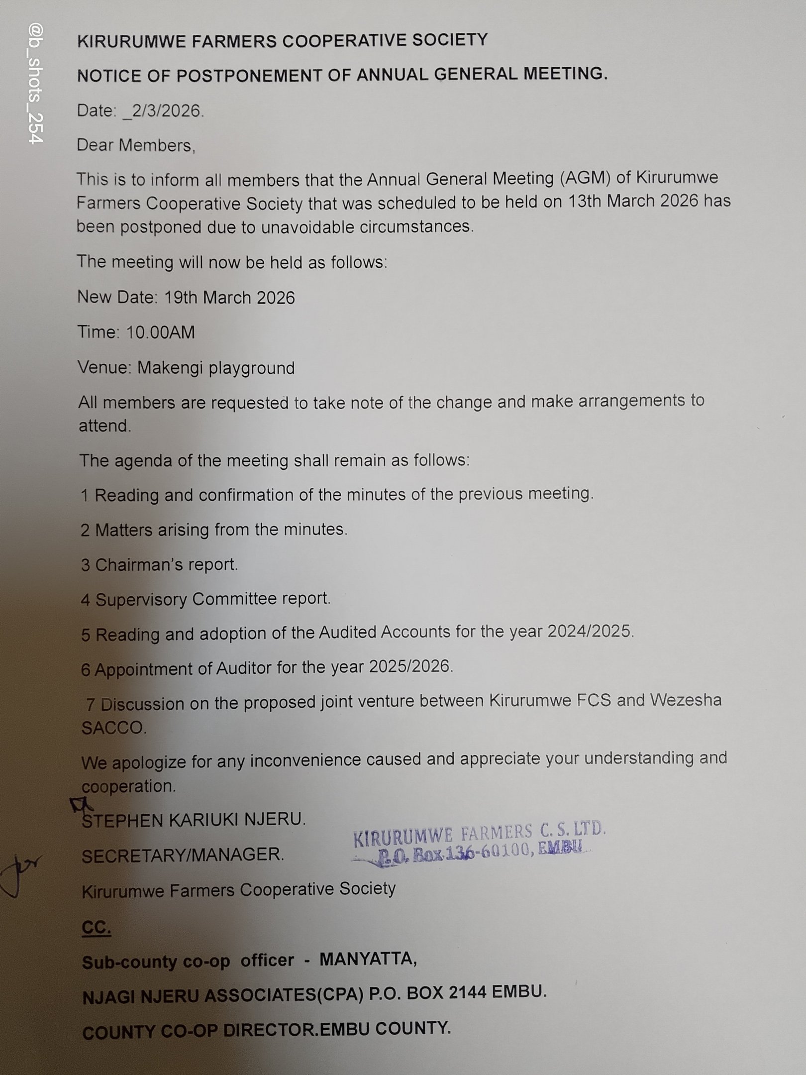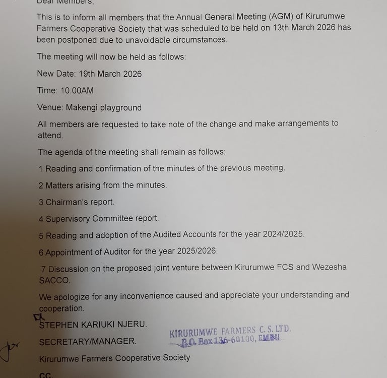 To all esteemed members of the Kirurumwe Farmers Cooperative Society (FCS), we wish to inform you of a crucial update regarding our upcoming Annual General Meeting (AGM). Originally scheduled for March 13, 2026, we have made the decision to postpone the meeting due to unavoidable circumstances.The rescheduled Annual General Meeting will now take place on March 19, 2026, starting at 10:00 AM. The venue for the meeting will remain at the Makengi Playground.