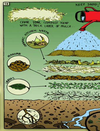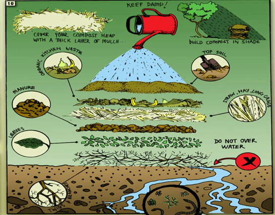 Provide the right environment – Compost should be kept under shade to prevent excessive drying. If heavy rains are expected, cover the heap with tough dry matter or a breathable plastic sheet.