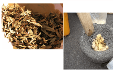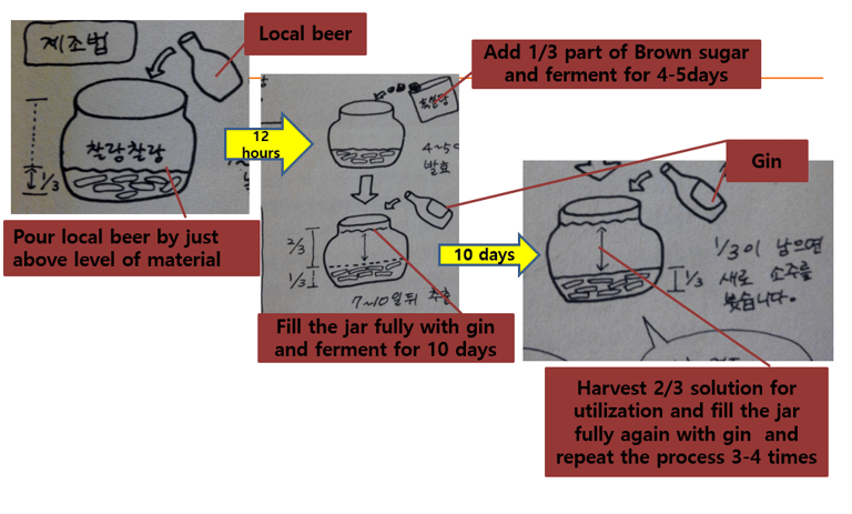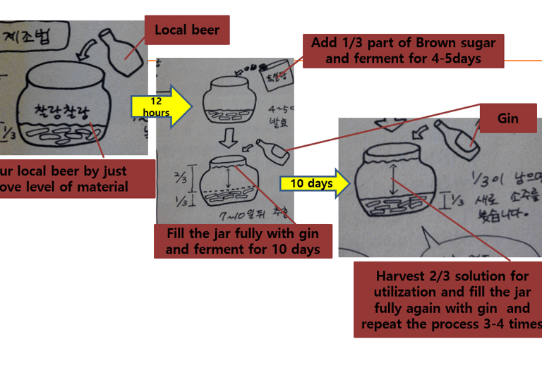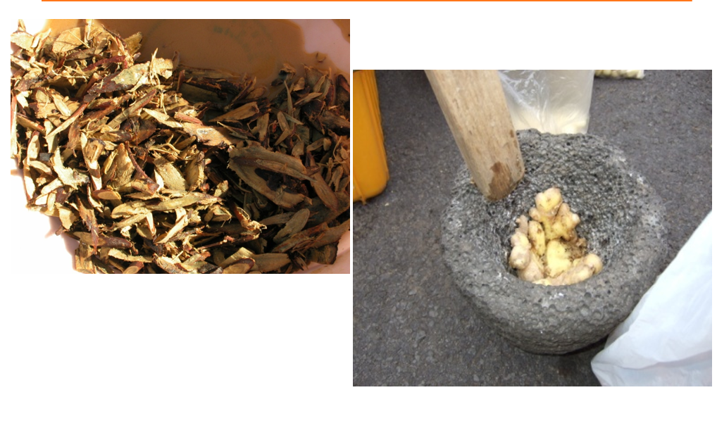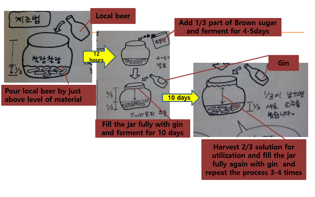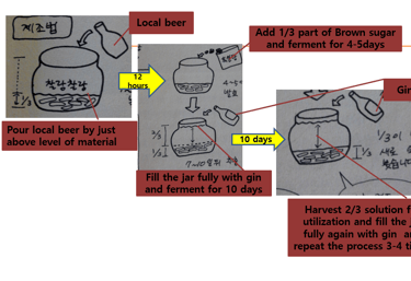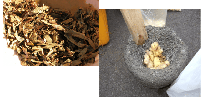 •Fill 1/3 level of a jar or plastic container with only one raw material in each container(ginger or garlic) and add local beer up to just soaking level of the material and keep it for 12 hours.