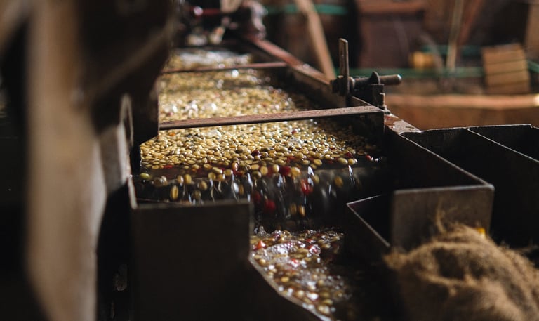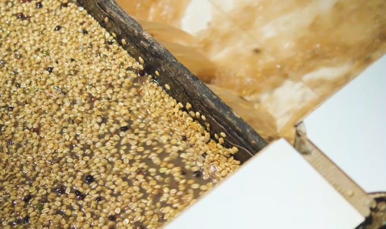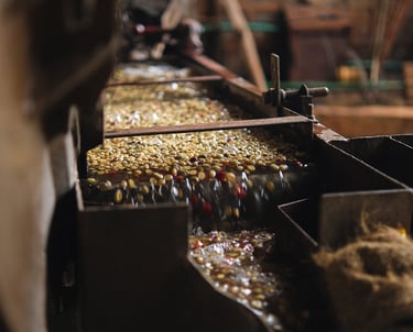 The coffee is then washed and dried on raised beds for 7–15 days, depending on the weather, until it reaches the desired moisture level.