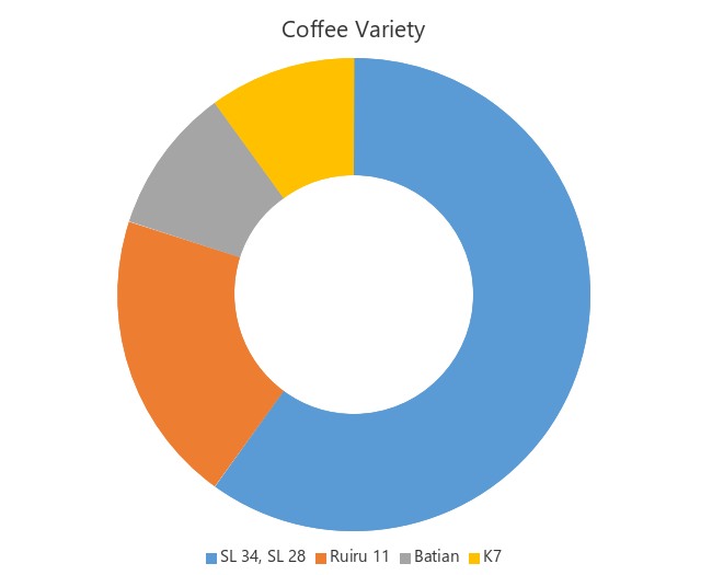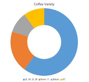 The distribution of varieties includes 60% SL34, SL28, and 20% Ruiru 11, and 10% Batian, and 10% K7.